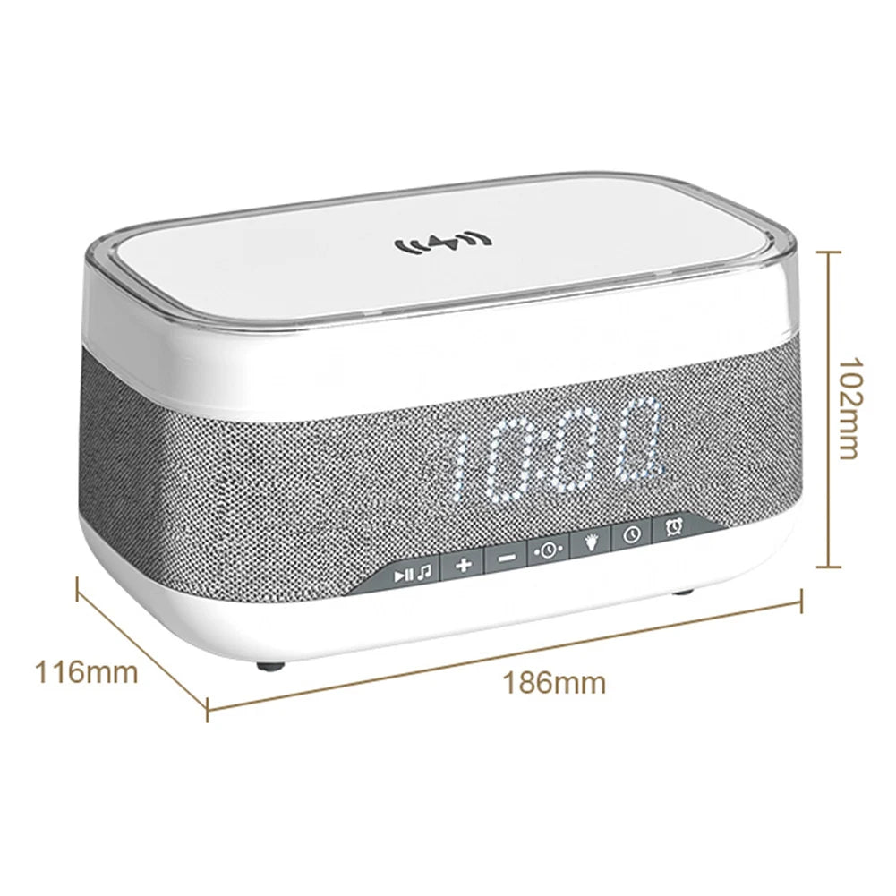 - All-in-One Convenience: Enjoy the convenience of having multiple essential functions integrated into one device. This alarm clock seamlessly combines an alarm clock, wireless charging station, Bluetooth speaker, time display, and 7-color night light, eliminating clutter and maximizing space.